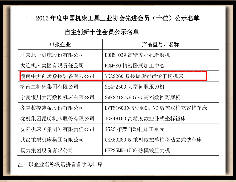 近日,中国机床工具协会2015年度十佳企业评定结果公示完毕,中大创远凭借产品螺旋锥齿轮干切削机床YKA2260(简称“YKA2260”)揽获中国机床行业“自主创新十佳”奖。