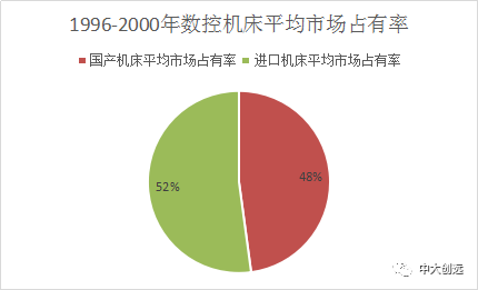 1996~2000年“九五”期间,是我国数控机床提高市场占有率时期。机床消费总量达到171.01亿美元,国产机床平均市场占有率47.87%,1996年仅达到36.89%.“九五”期间累计工业总产值1737.88亿元,提供各类机床80.18万台,其中数控机床4.73万台,2000年产值数控化率8%.数控机床品种超过1500种,能够生产五轴联动加工中心、车削中心、高速高精数控机床。